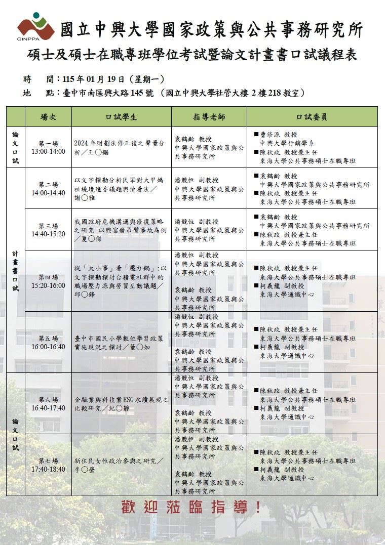 115.01.19 國務所碩士及碩士在職專班學位考試暨論文計畫書口試議程表