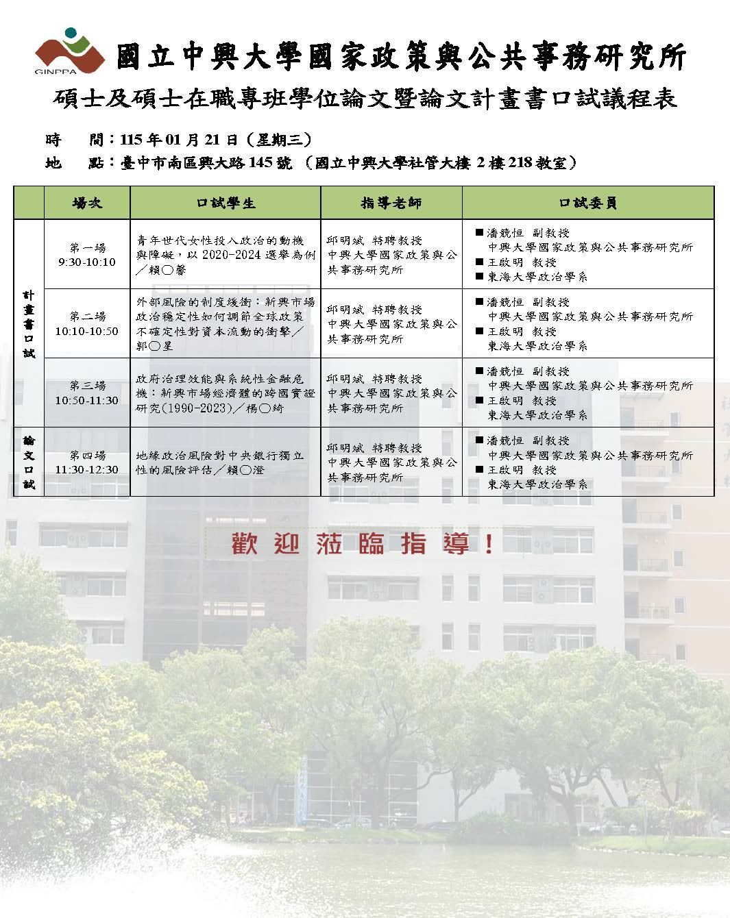 115.01.21 國務所碩士及碩士在職專班學位考試暨論文計畫書口試議程表