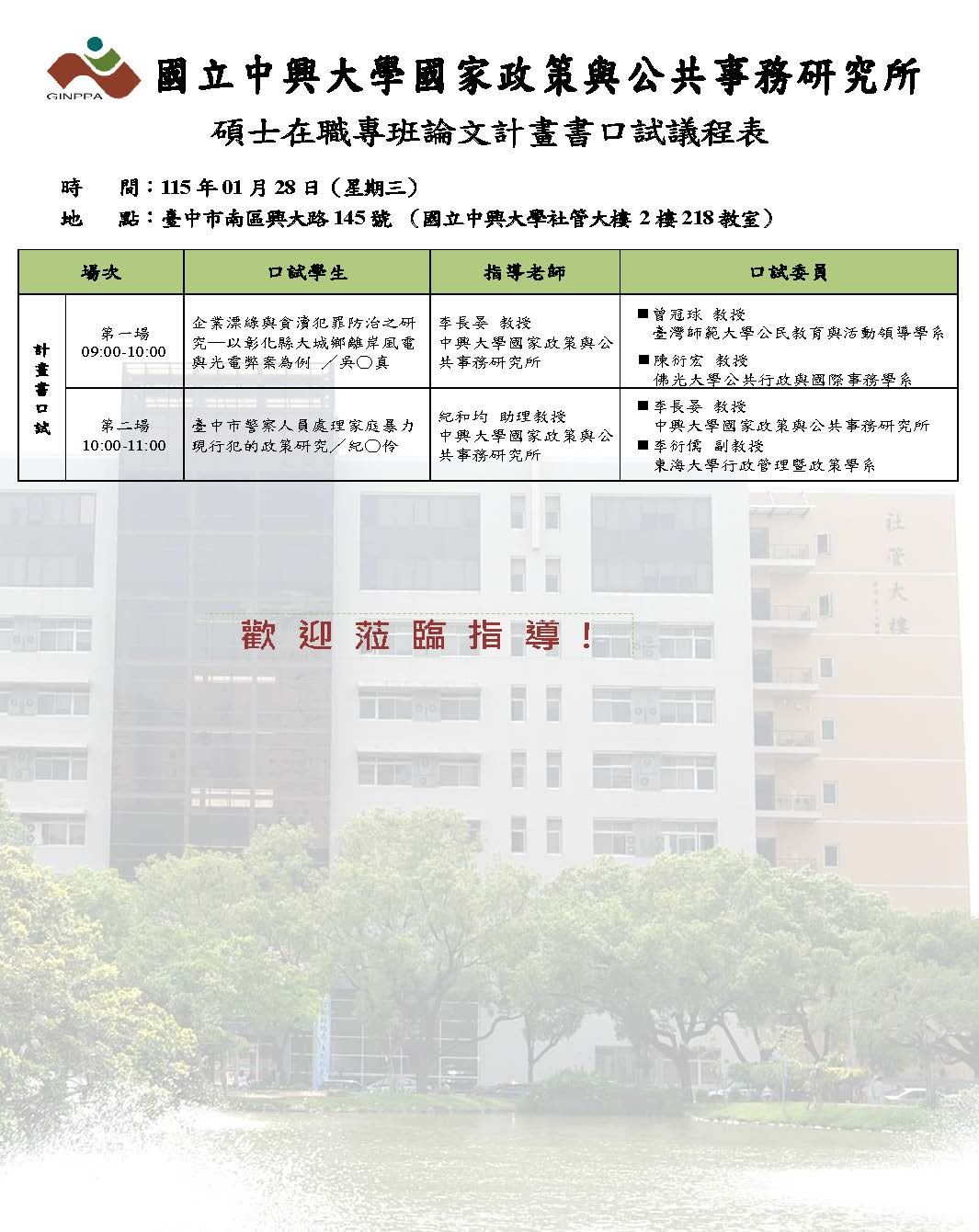 115.01.28 國務所碩士在職專班論文計畫書口試議程表